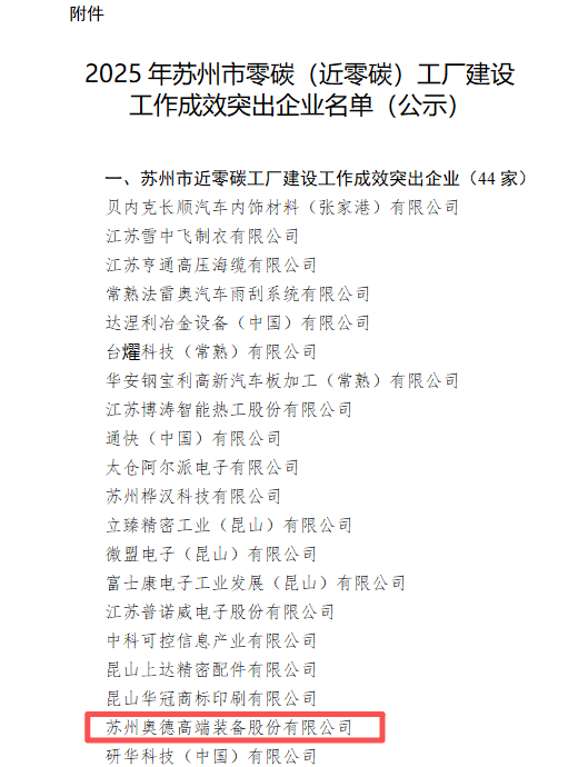 經過嚴格的評審與篩選,蘇州奧德高端裝備股份有限公司(以下簡稱“奧德”)憑借其在綠色制造、節能減排方面的卓越實踐與突出成效,成功入選該名單,標志著公司在可持續發展的道路上邁出了堅實的步伐。